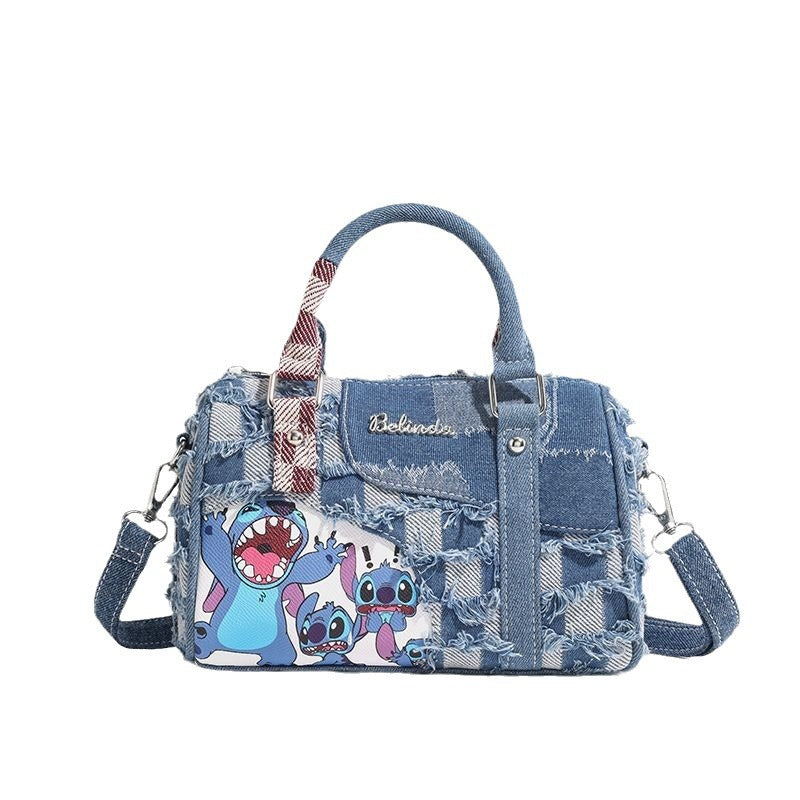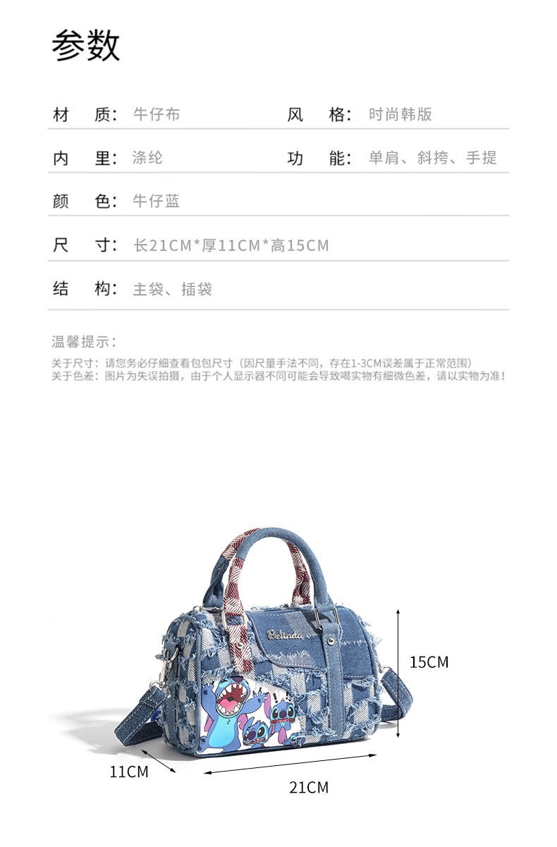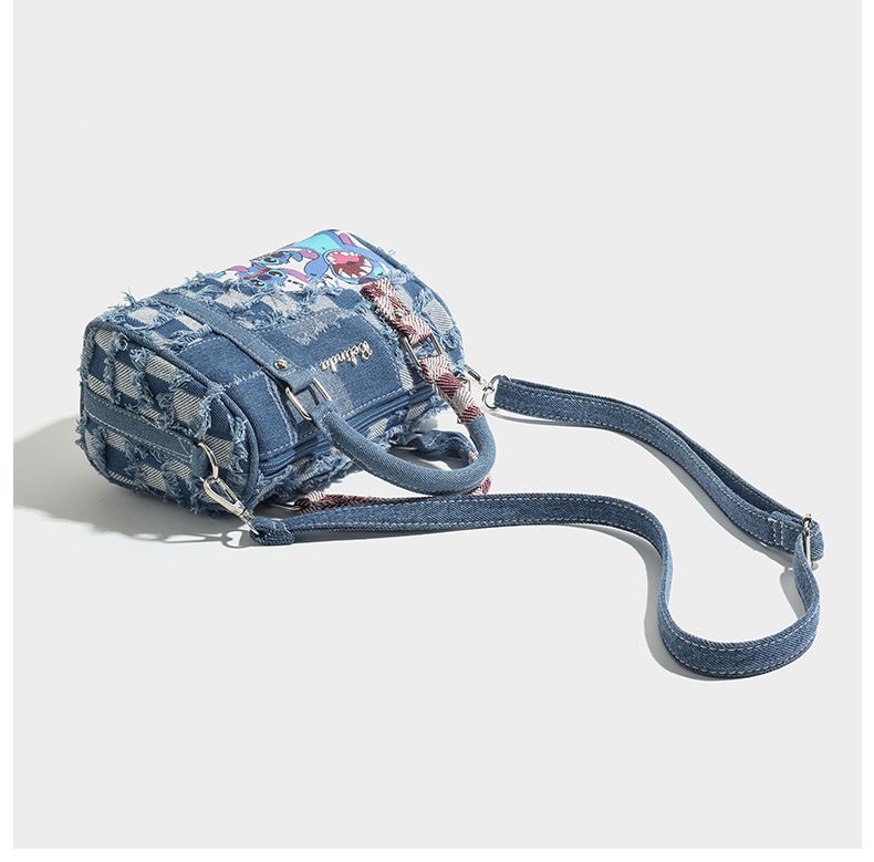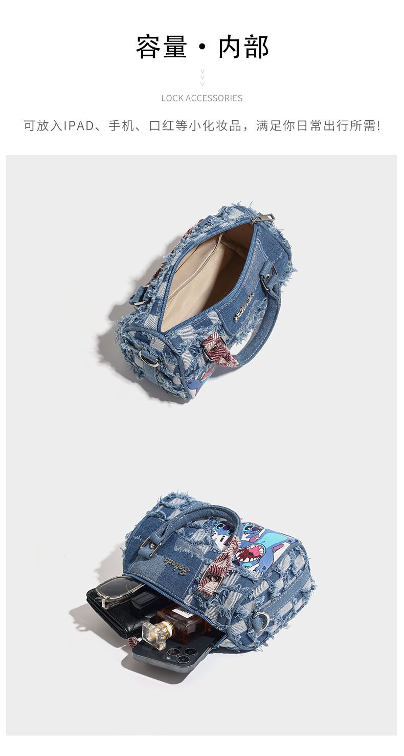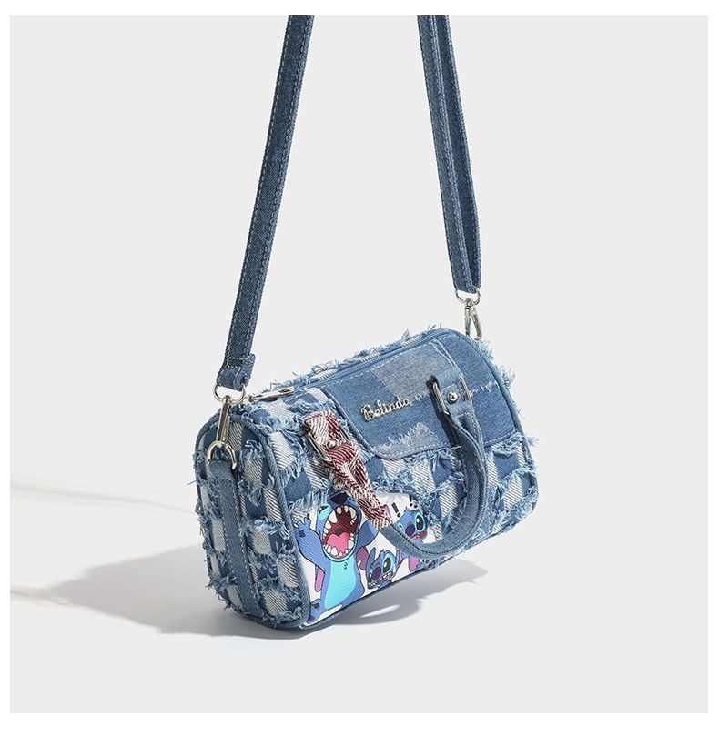 2024新款小众卡通史迪仔牛仔布破洞拼接斜挎手提女包枕头包水桶包