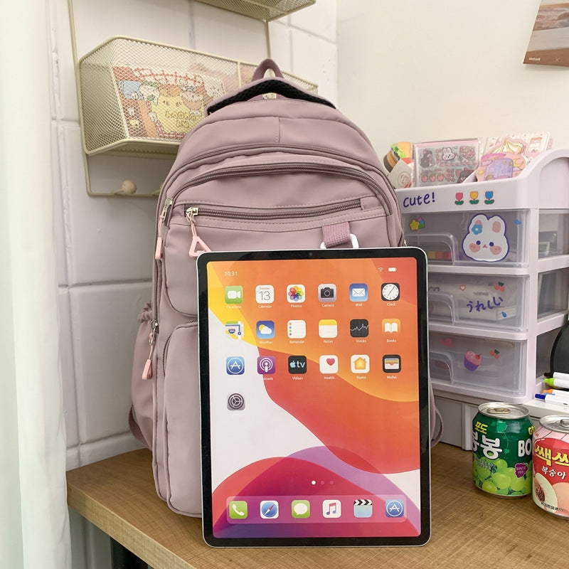 2024新款时尚简约纯色韩版双兜大容量学生书包女孩初中生双肩包