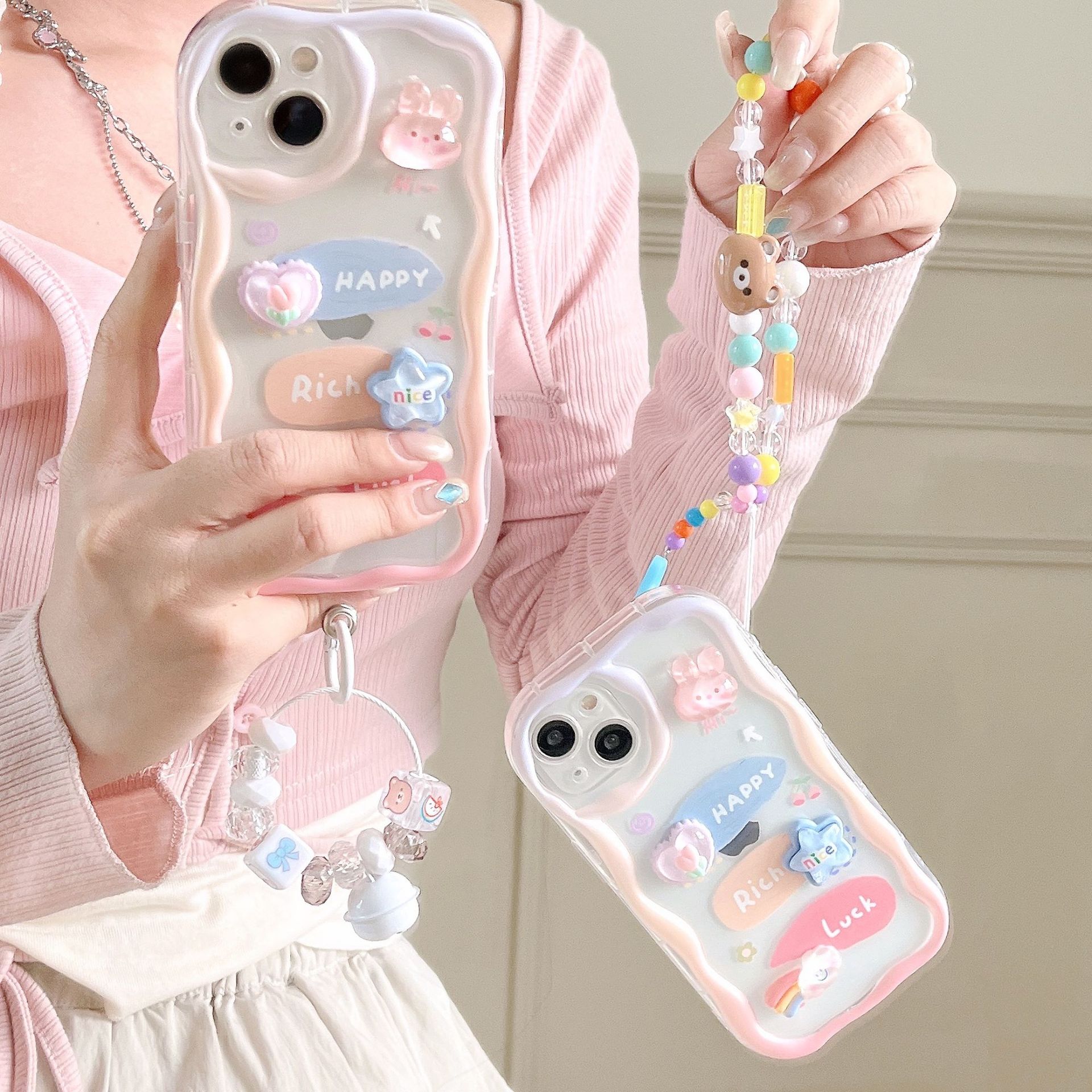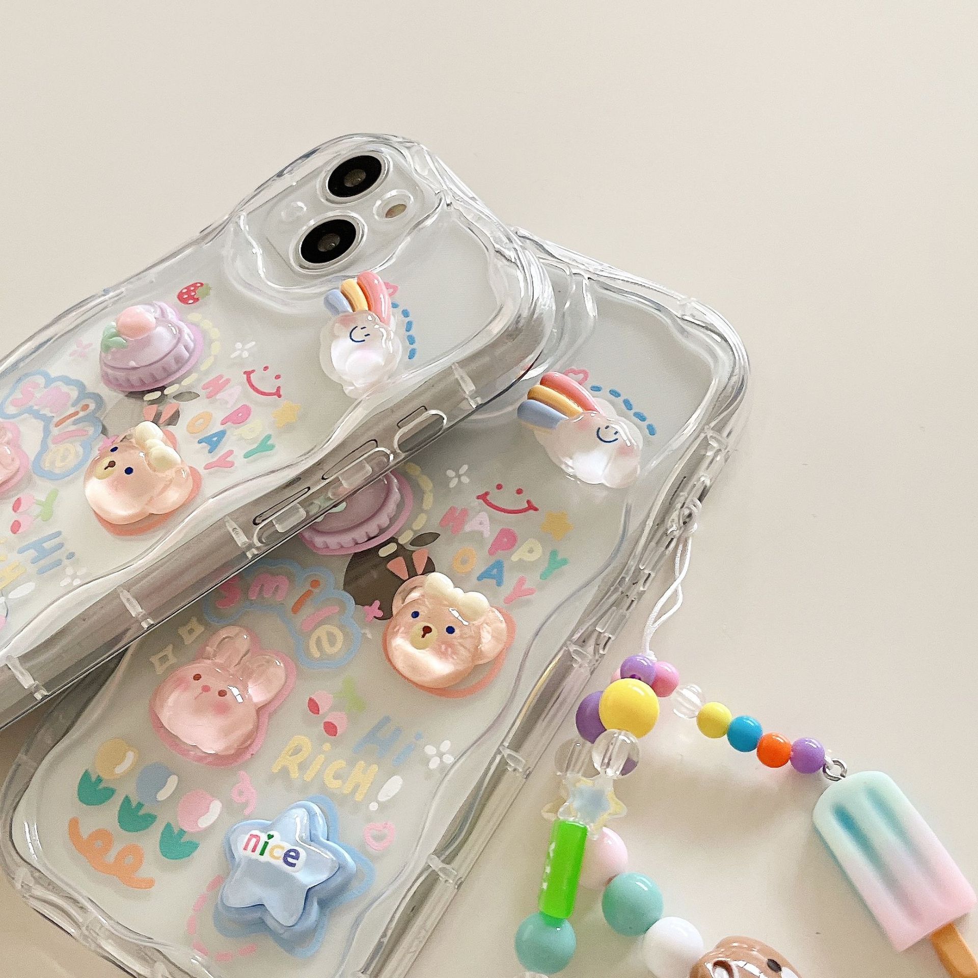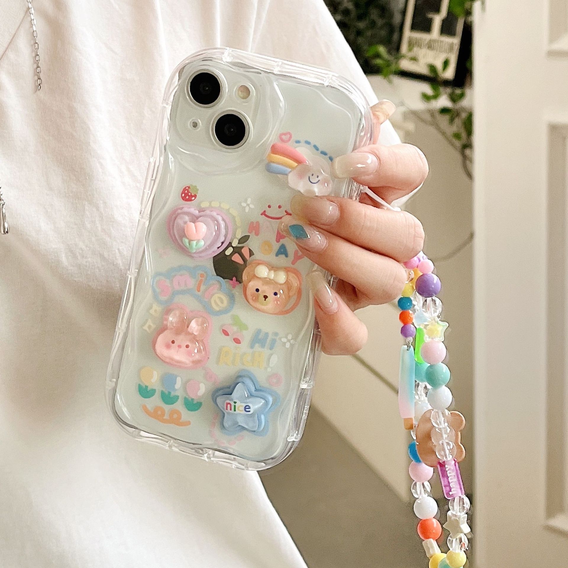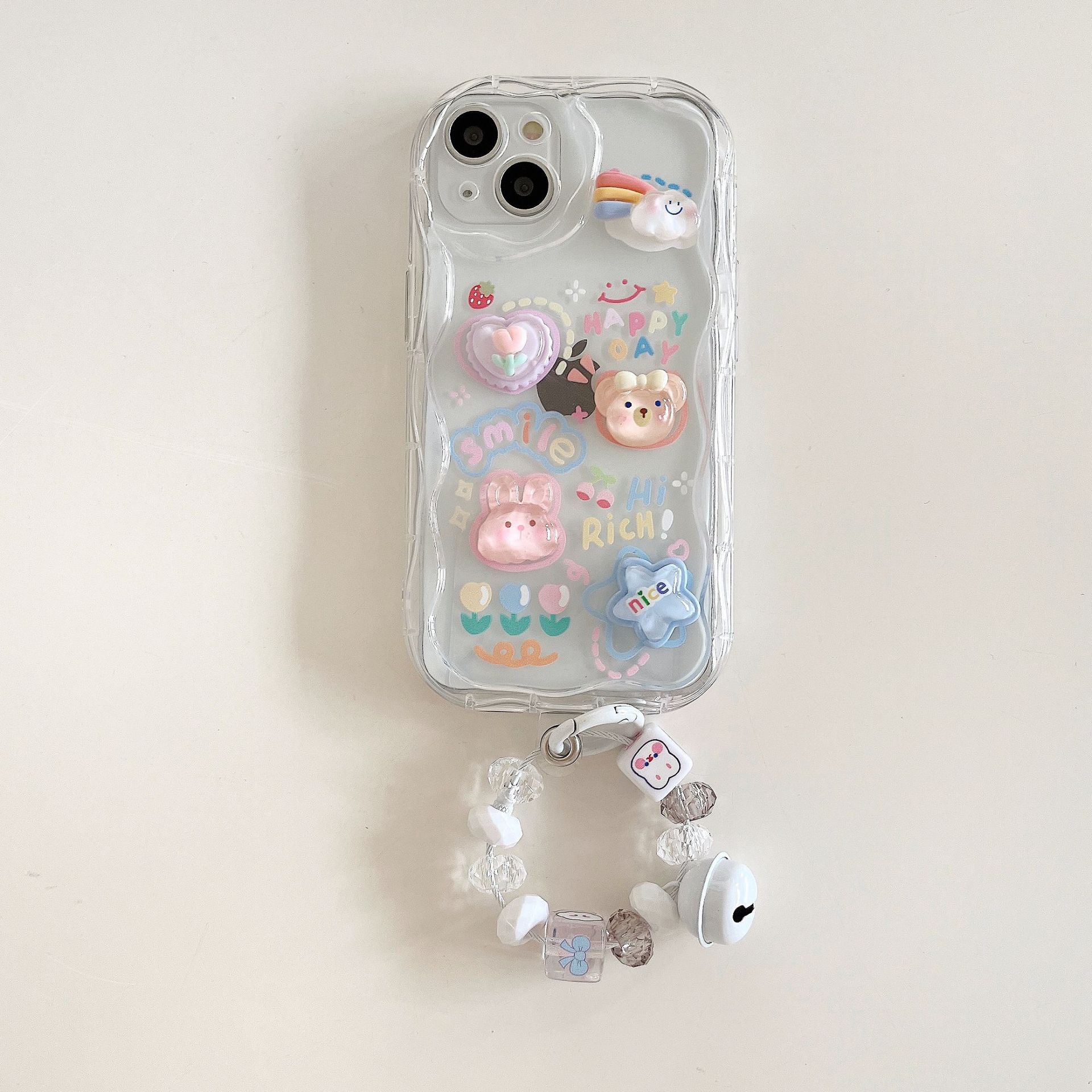 3D Bear Bunny Case iPhone15 Clear IP14 Pro Soft Shell Bell Pendant Chain
