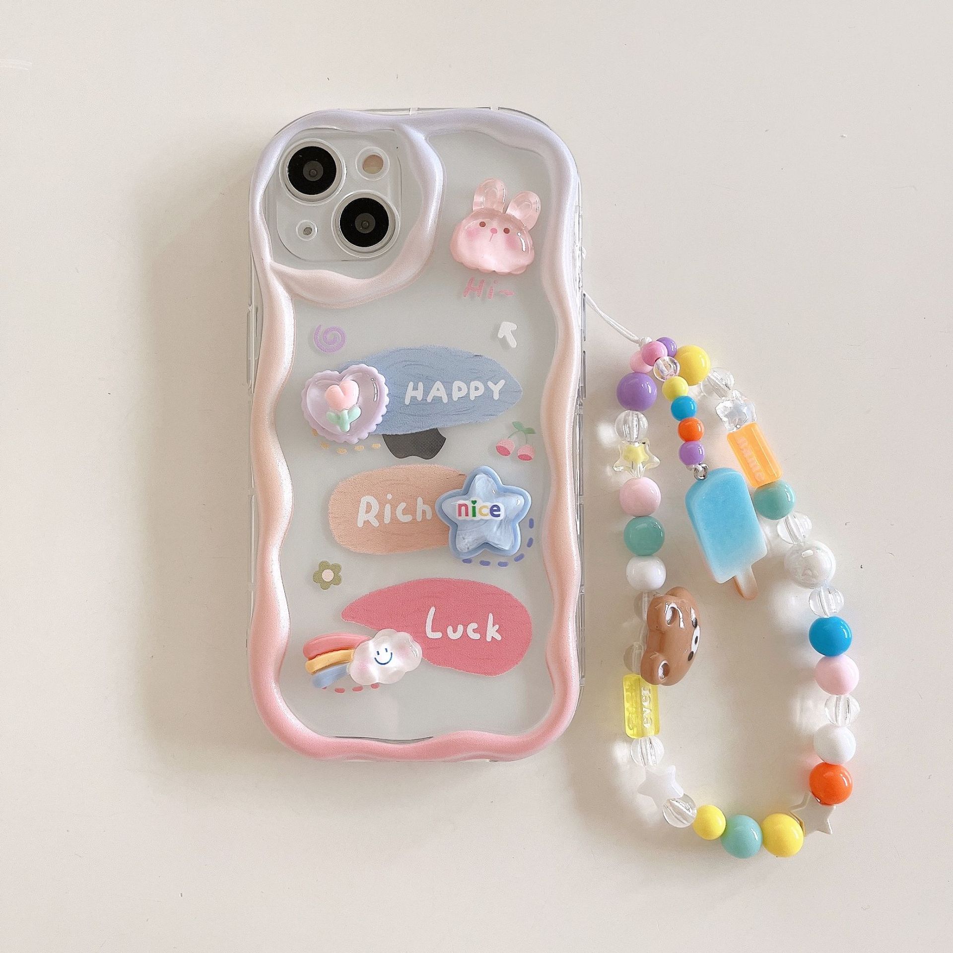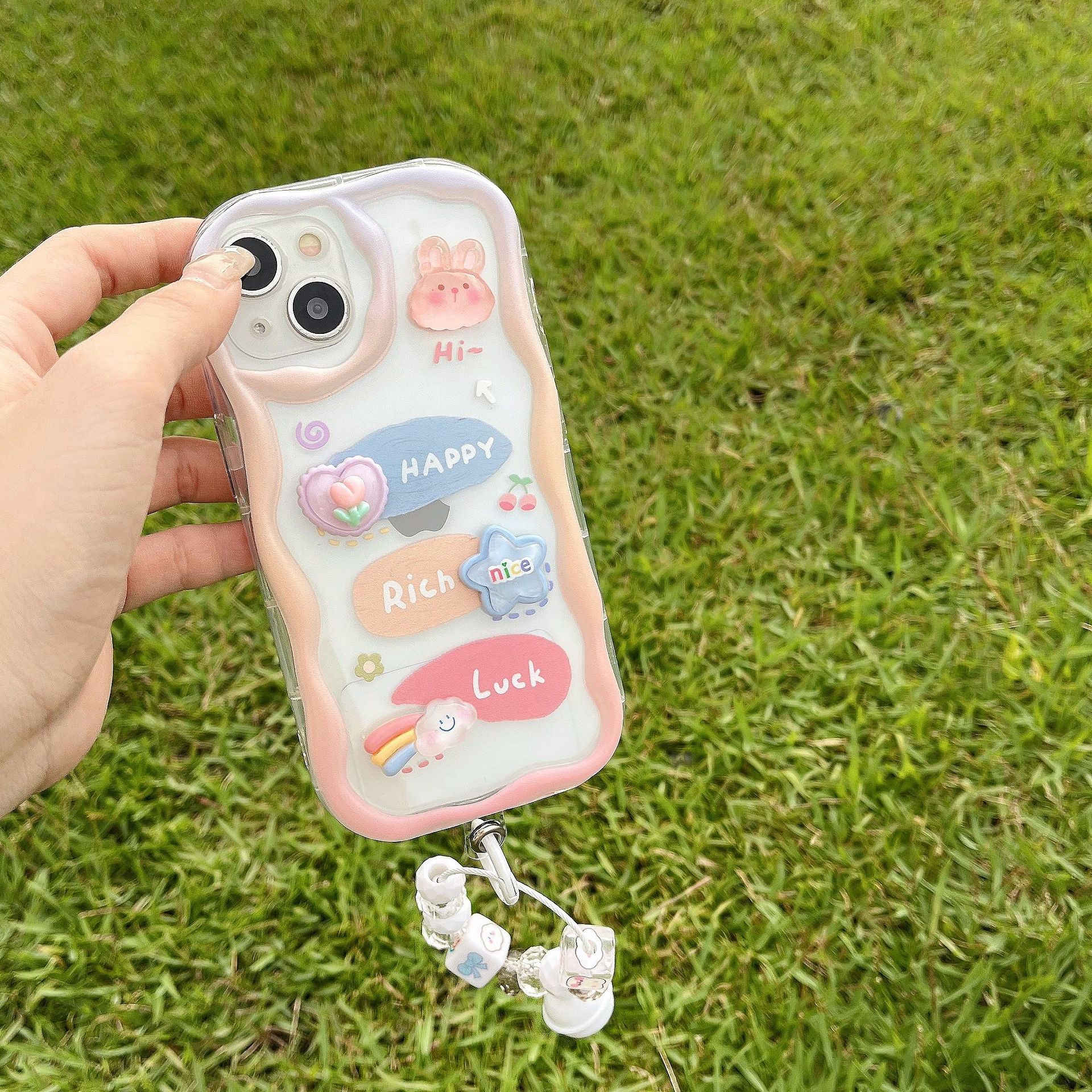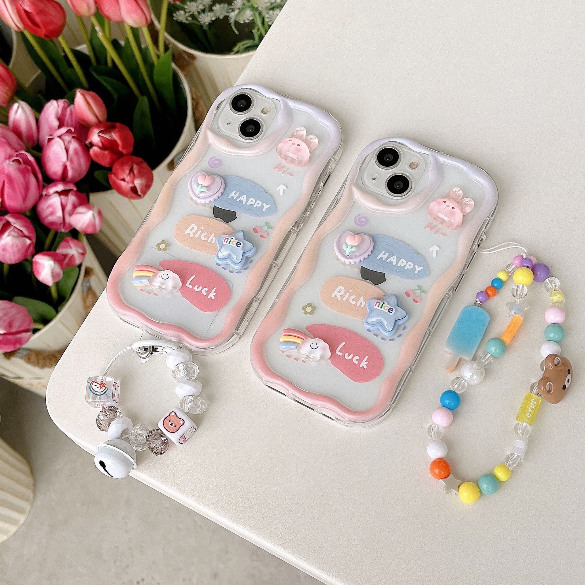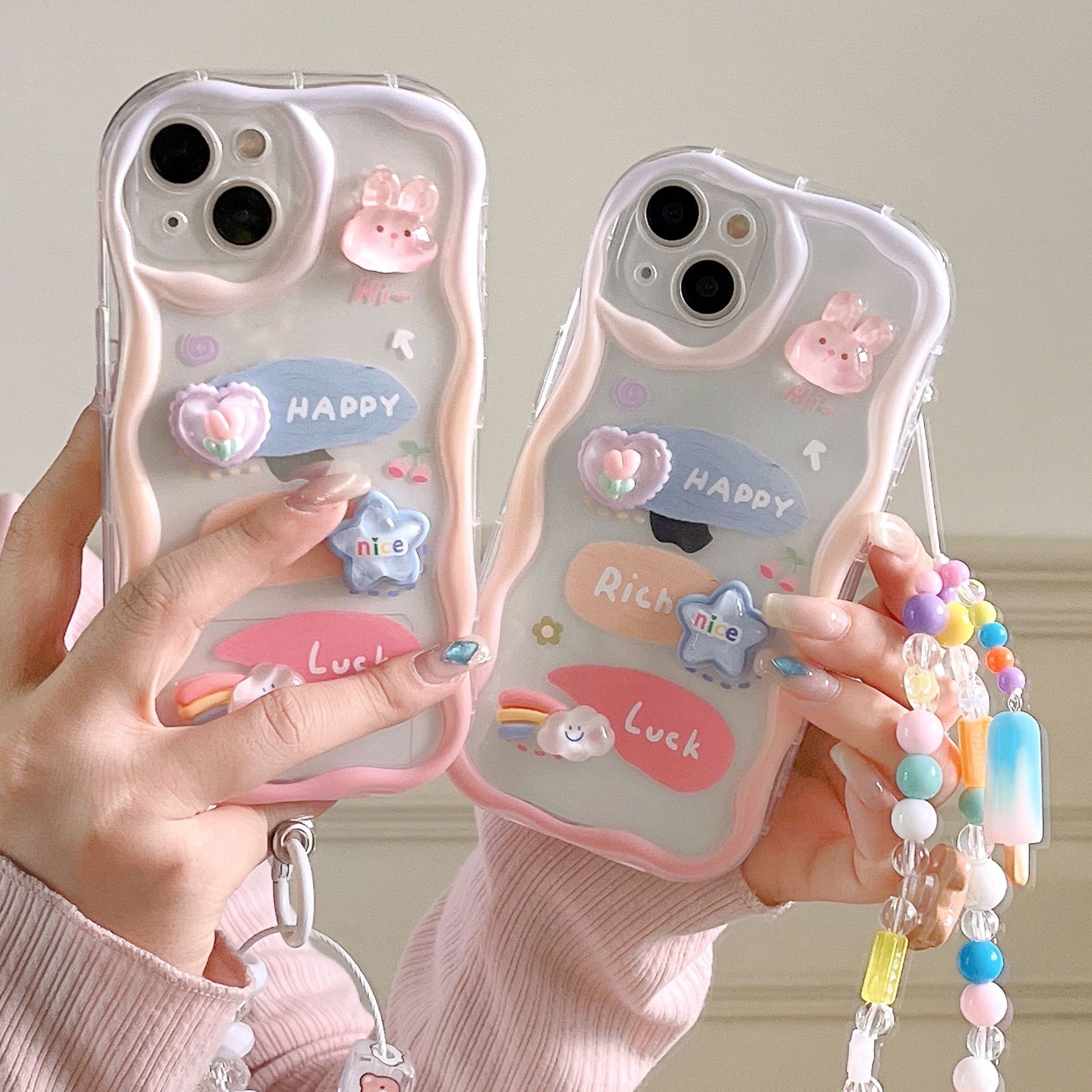 3D Bear Bunny Case iPhone15 Clear IP14 Pro Soft Shell Bell Pendant Chain