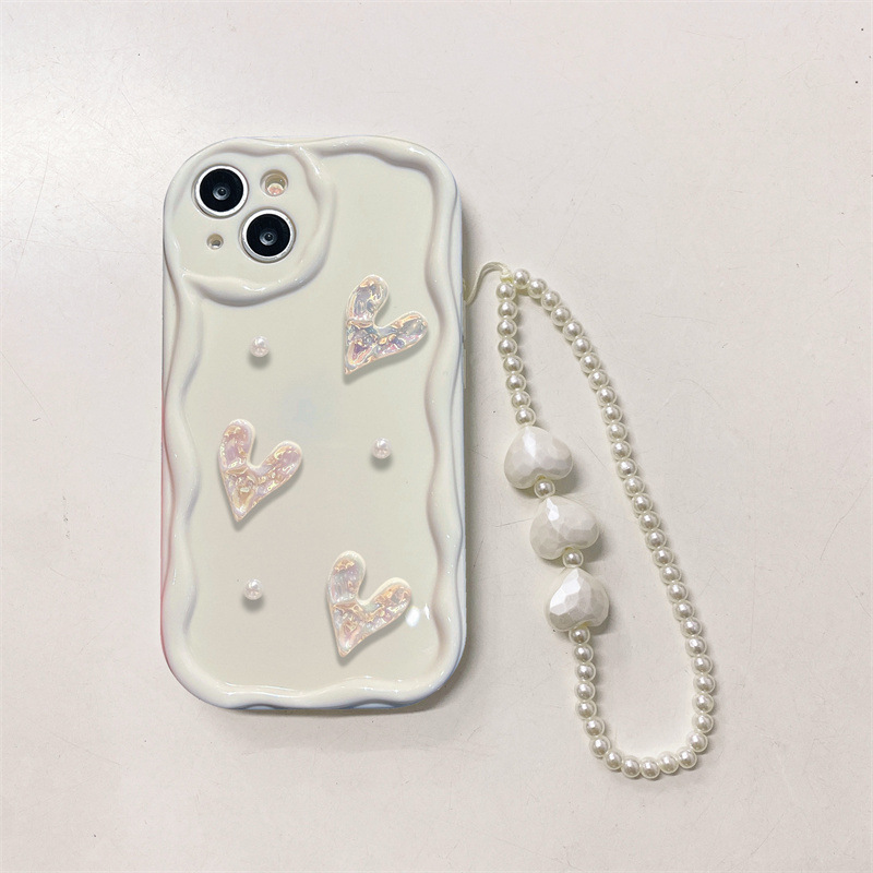 3D Wavy Edge Case iPhone15 Pro X 12 Heart Pearl Full TPU Cover