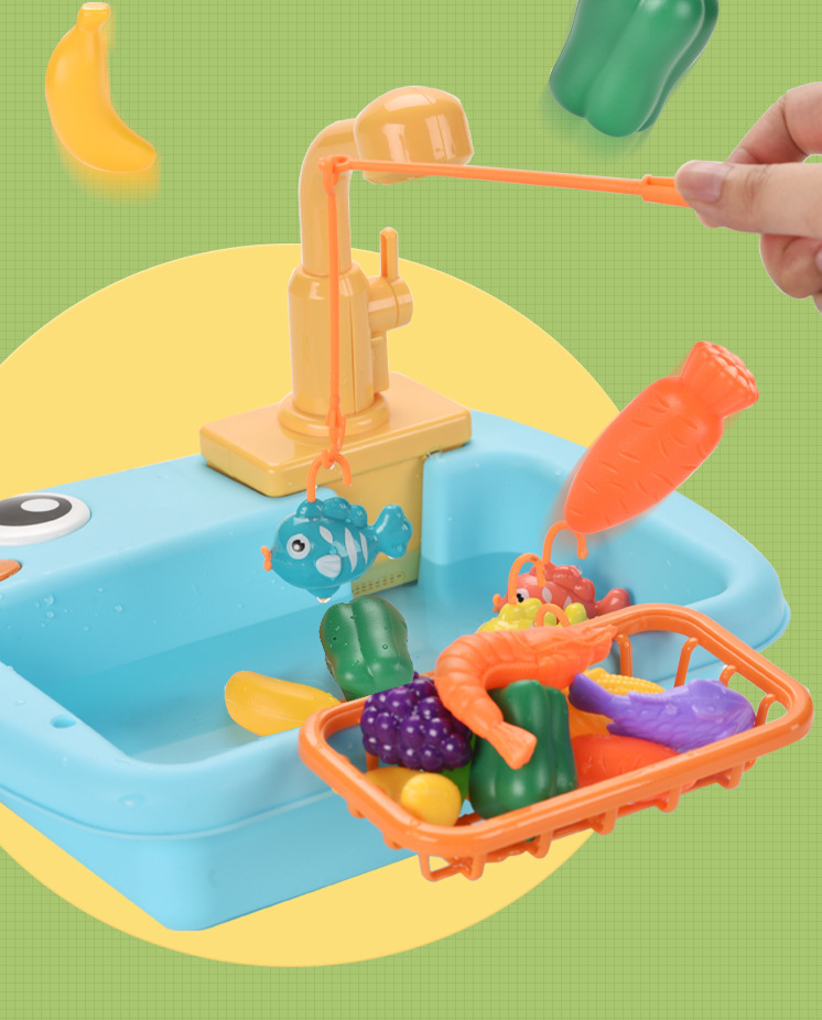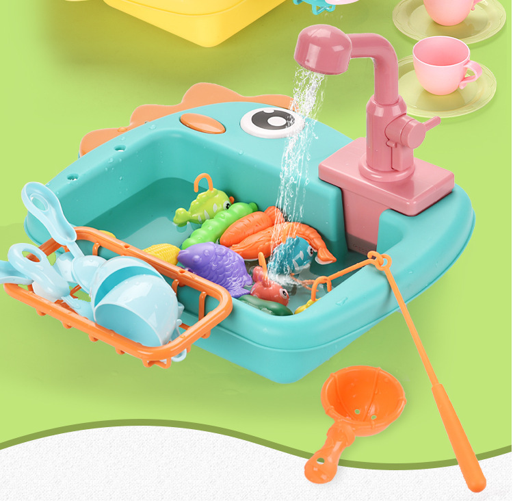 Children's Electric Dinosaur Dishwashing Sink Toy with Circulating Water Fishing Dishwasher 2-in-1 Kitchen Pretend Play Toy