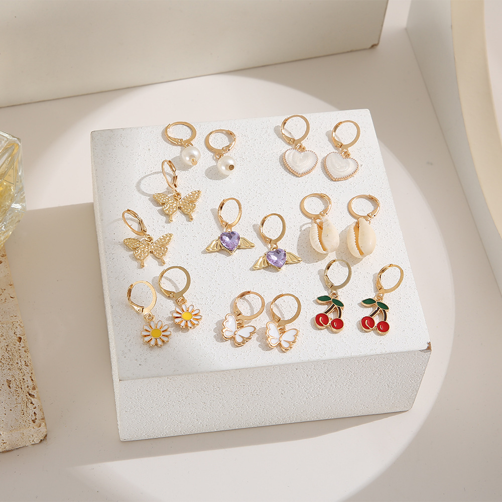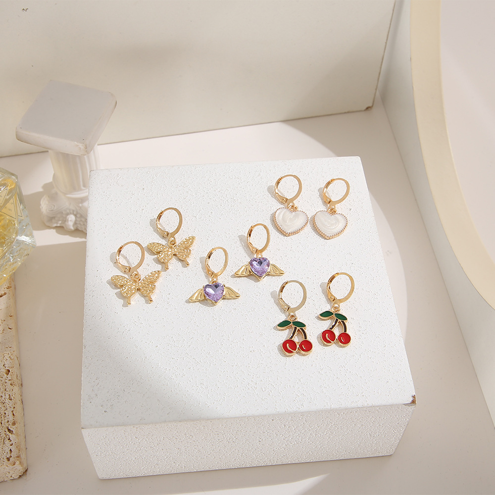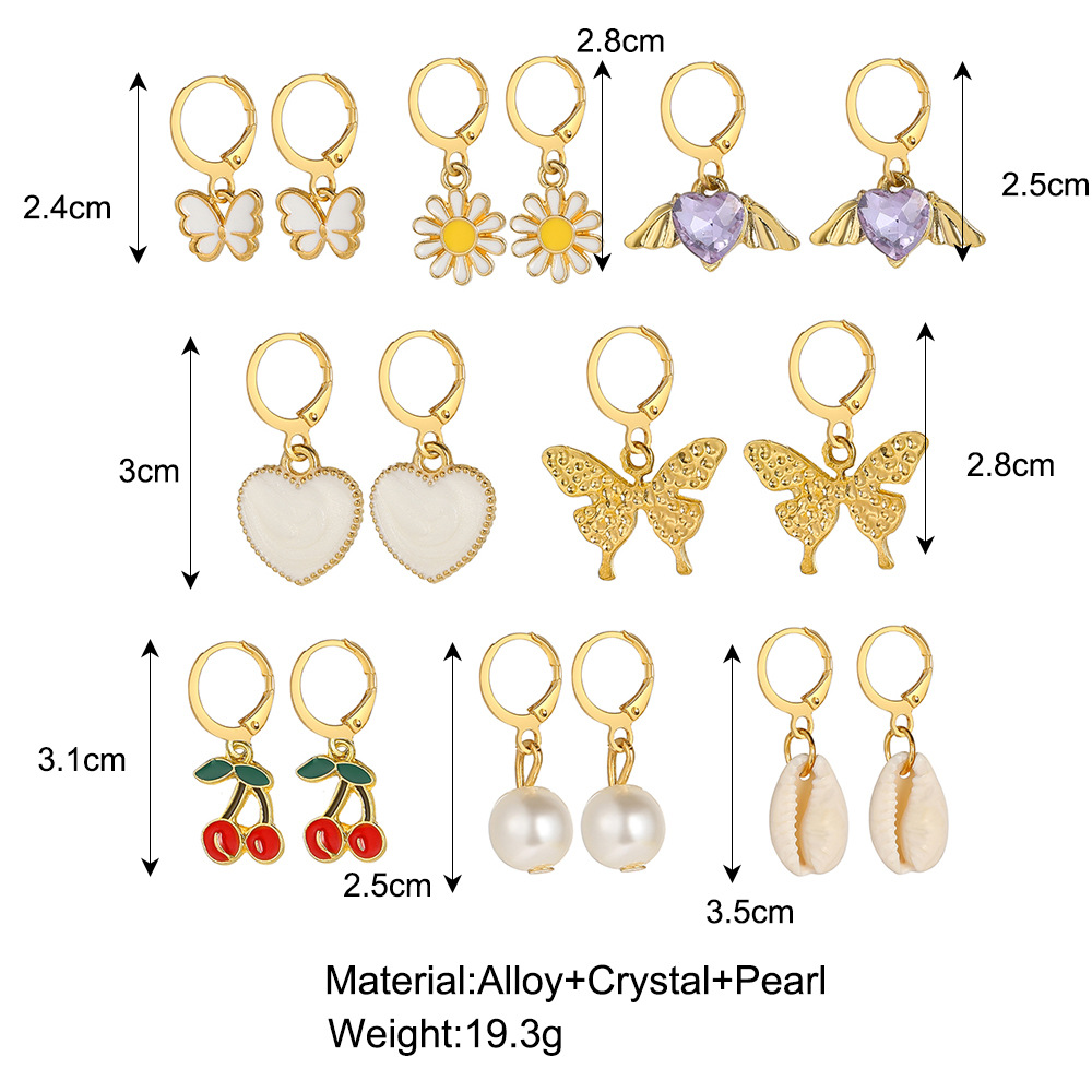 Earrings Set 9 Pairs Butterfly Heart Cherry Pearl