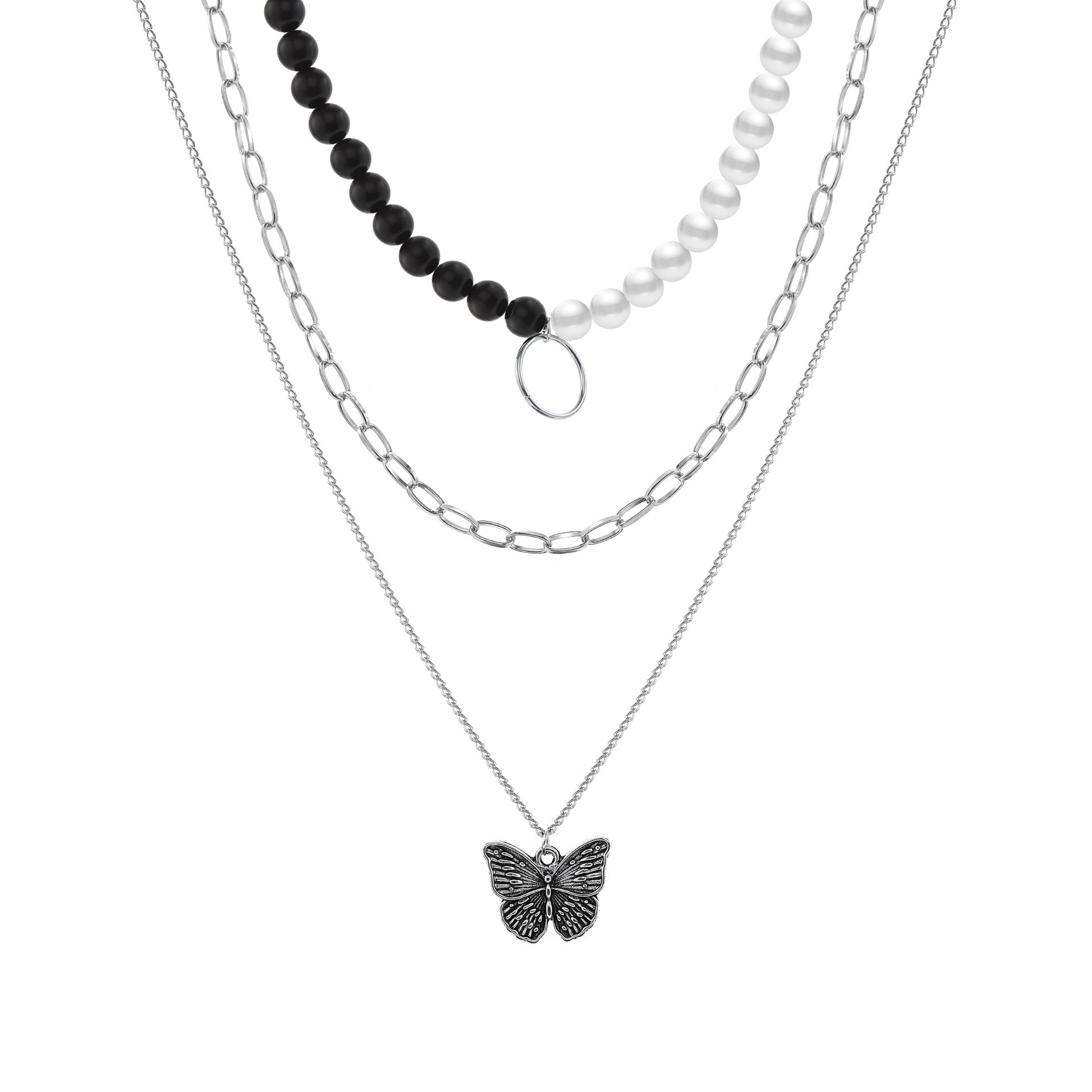 Butterfly Pendant Multi-layer Necklace Black and White Beads