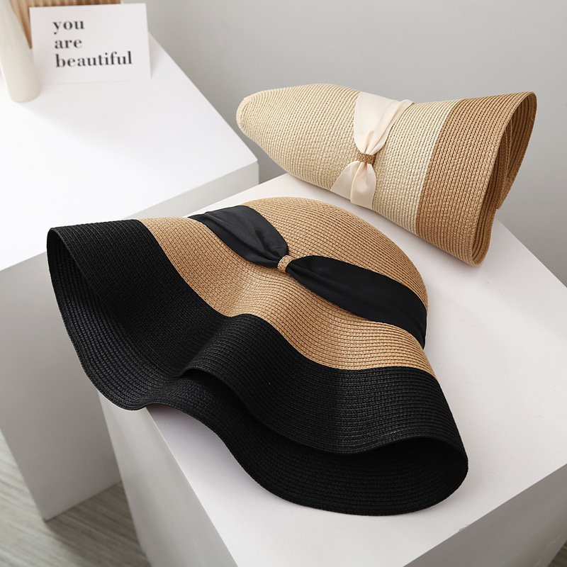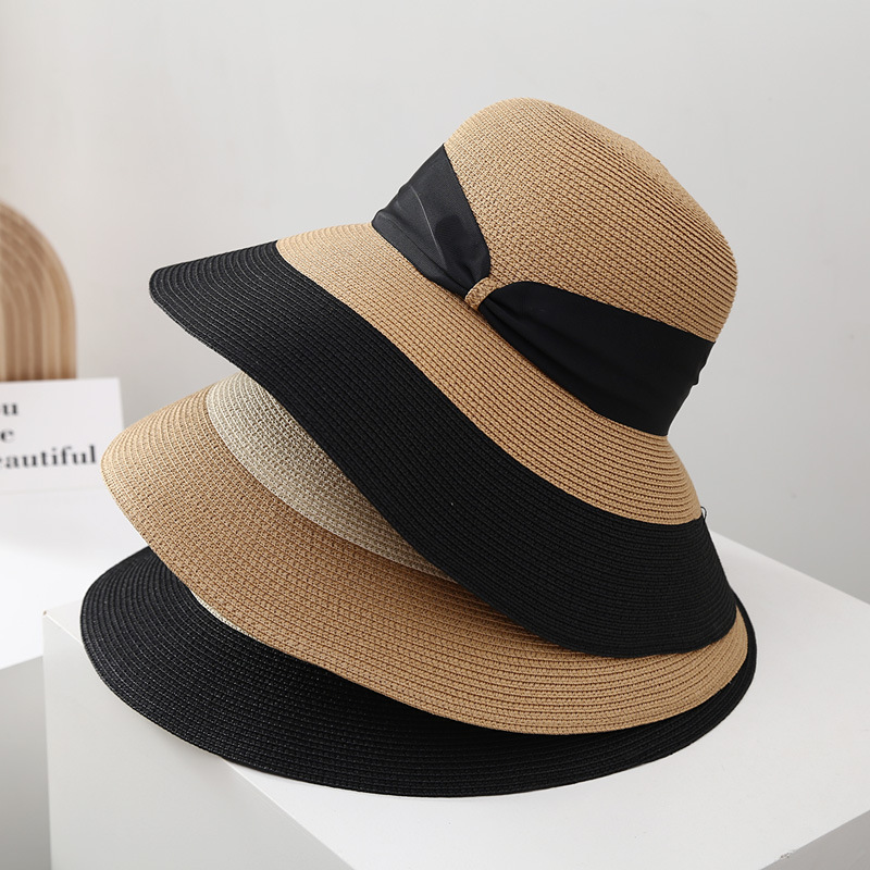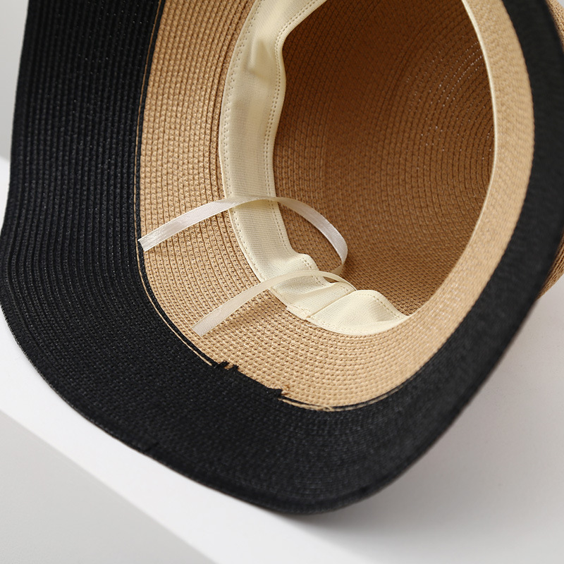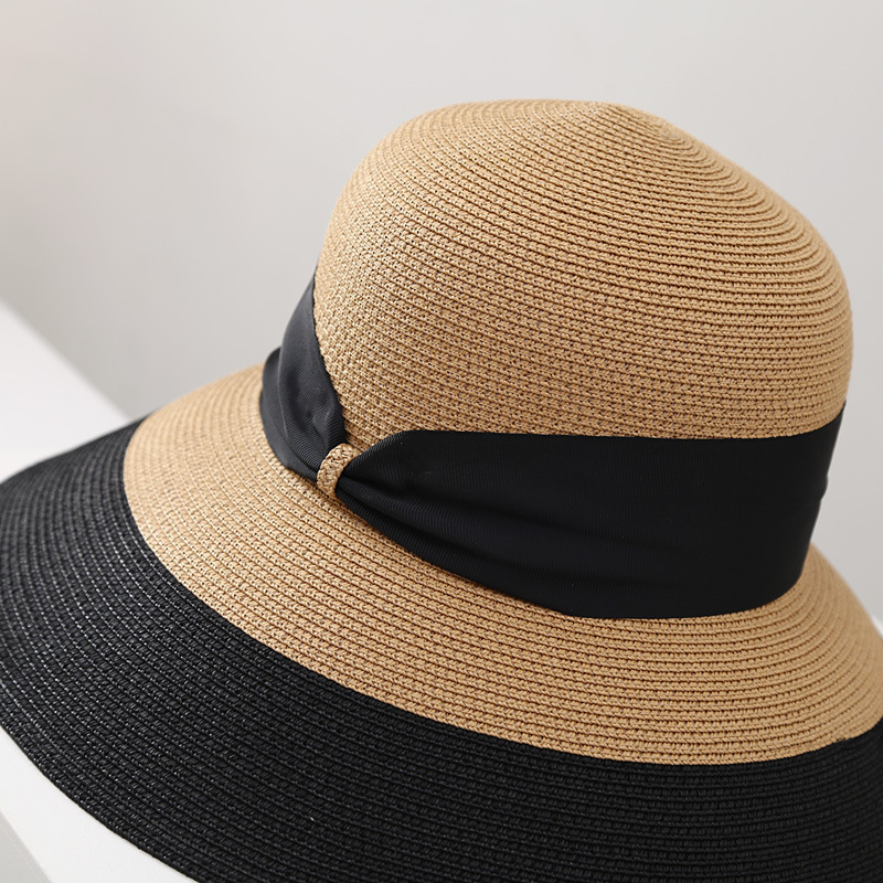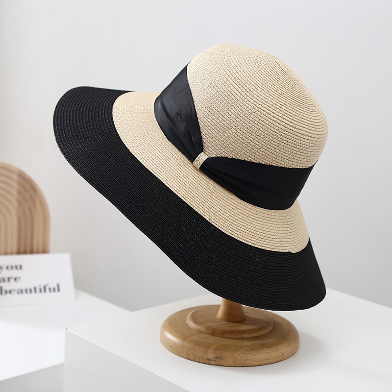 French Vintage Black-White Straw Hat Women Spring Summer Travel Wide Brim UV