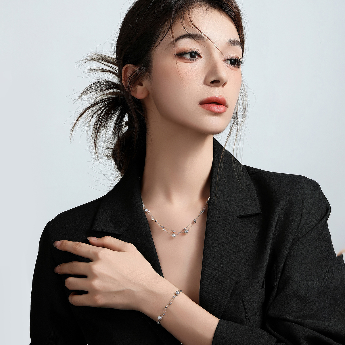 SKU:YY-0703-Steel - Double Layer - Grey Bead Necklace