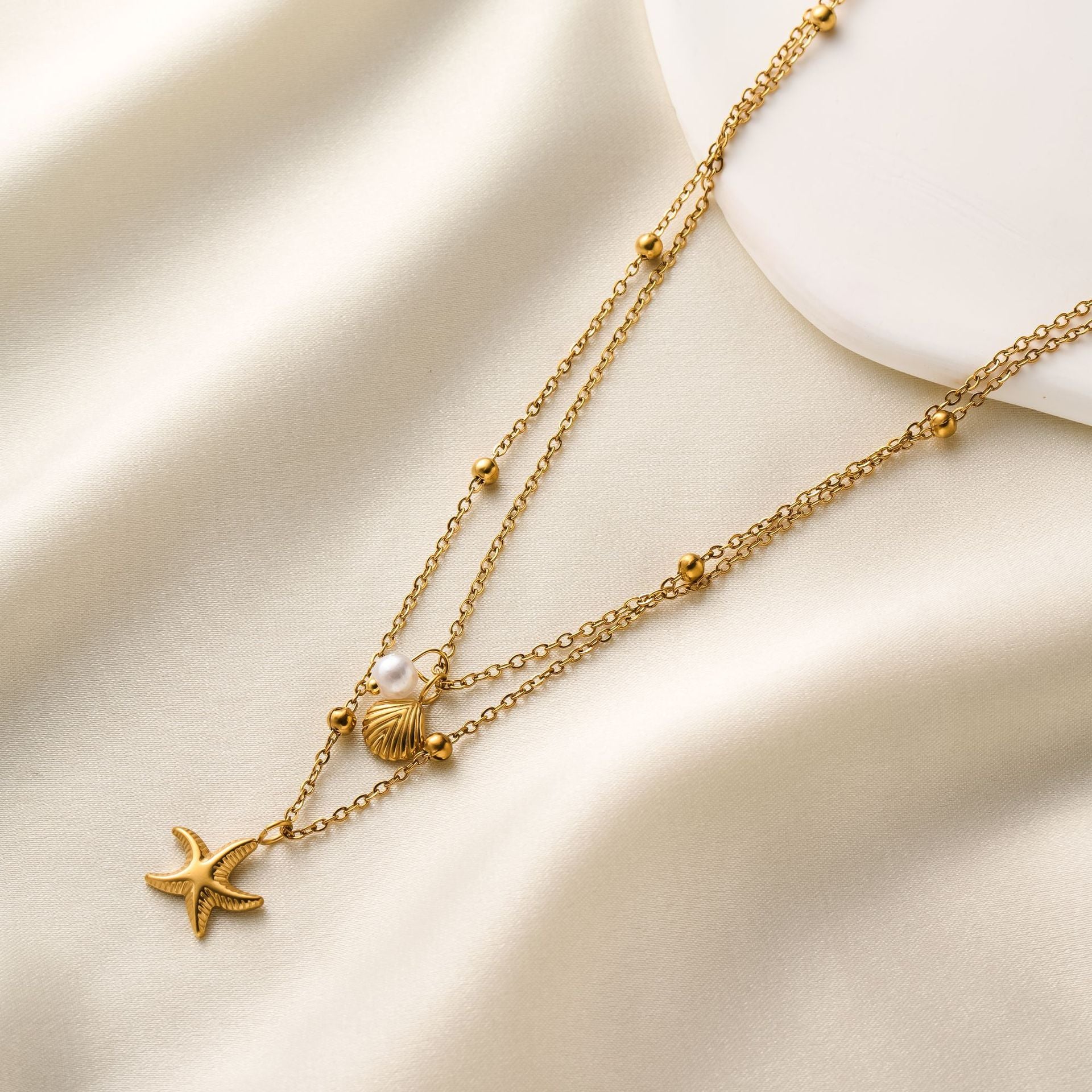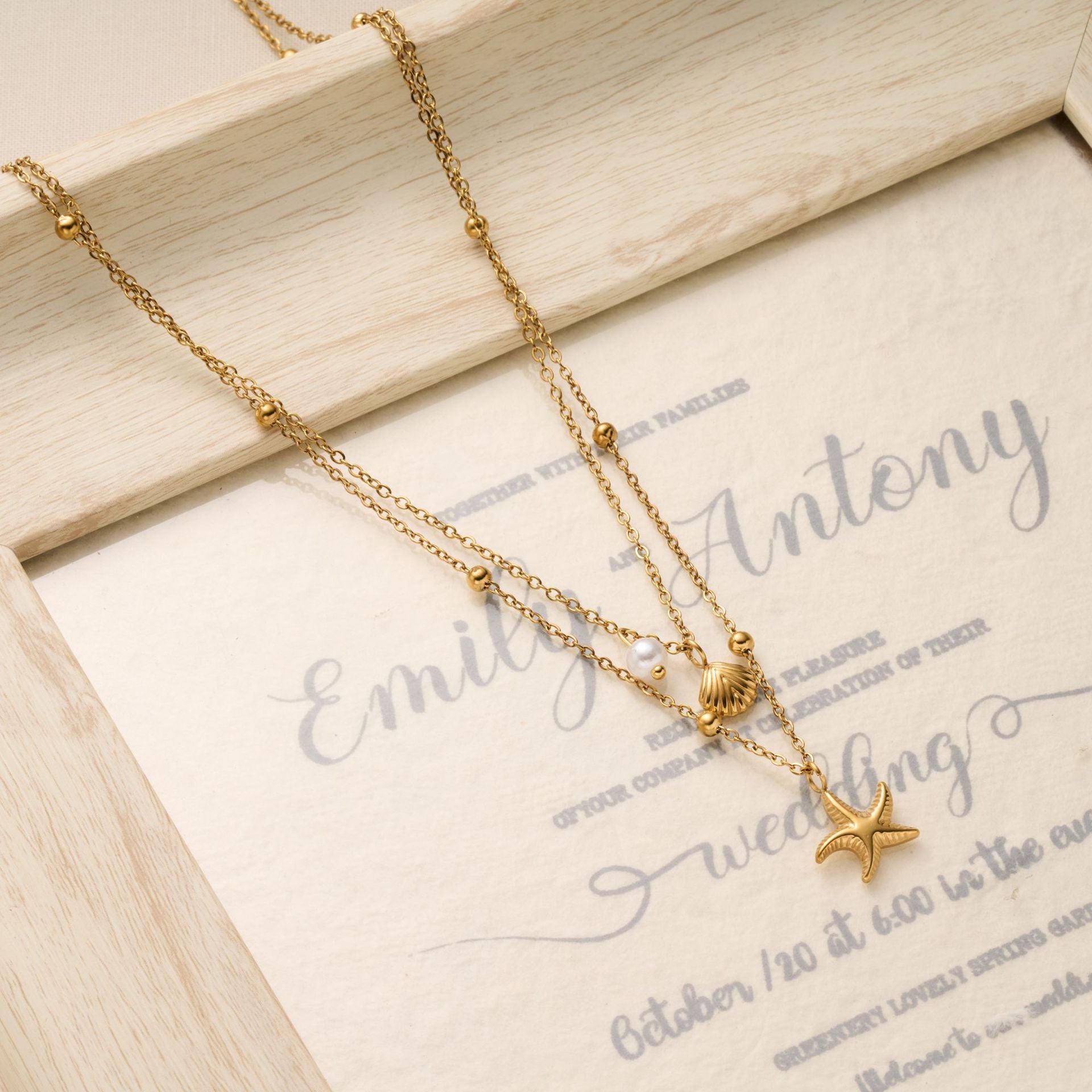 SKU:YY-0960-Gold Double Starfish Shell Necklace