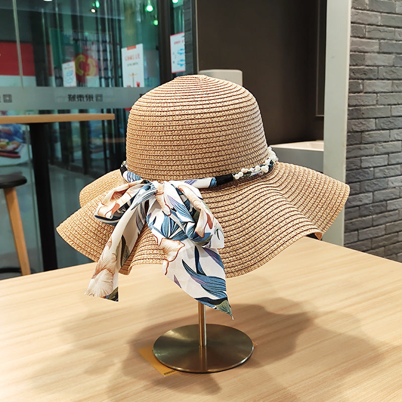 Wavy Edge Bow Straw Hat Summer Large Brim UV Protection