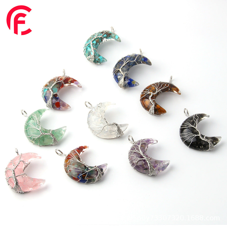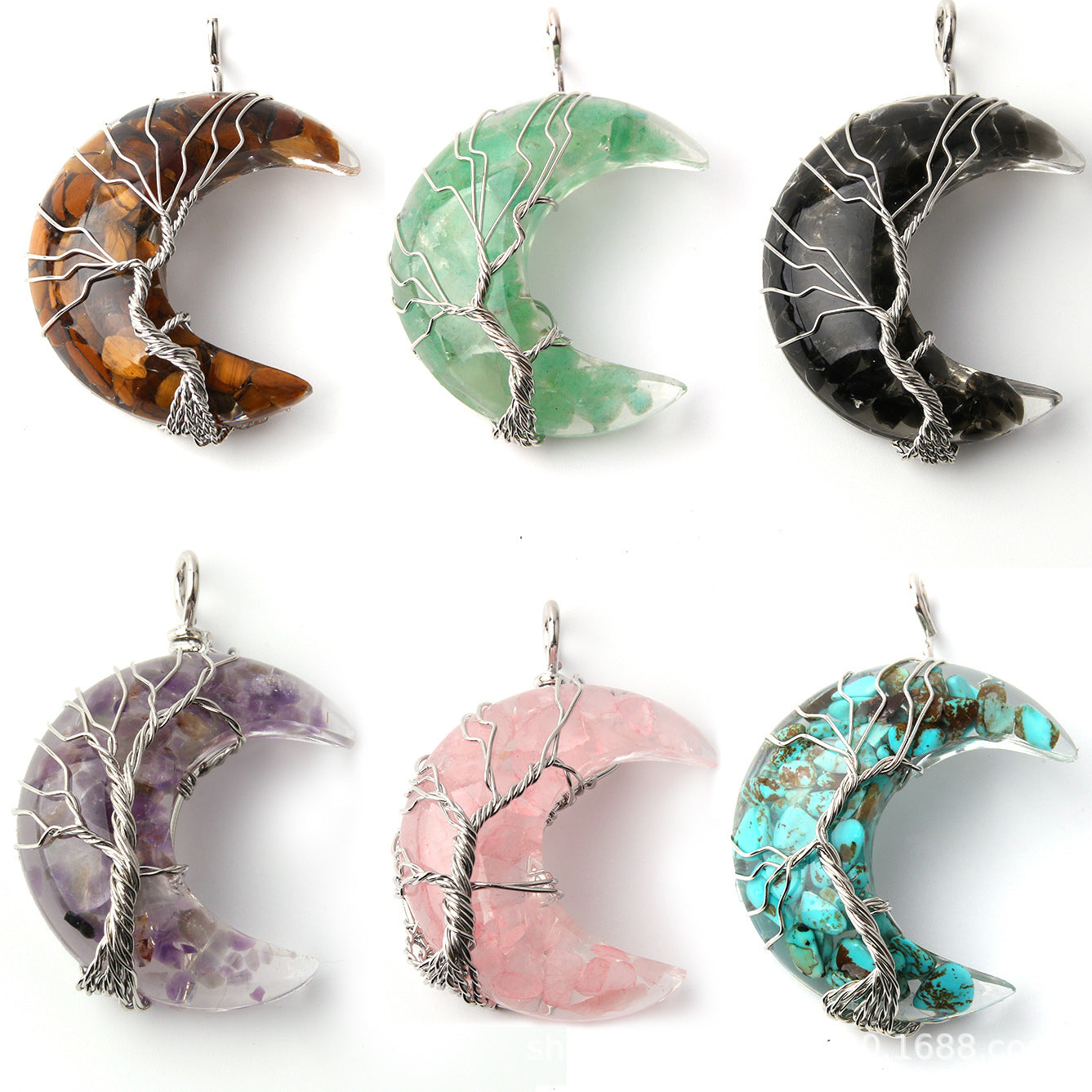 Pingente de cascalho da árvore da vida em forma de lua de cristal