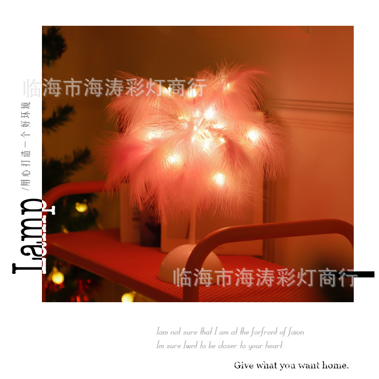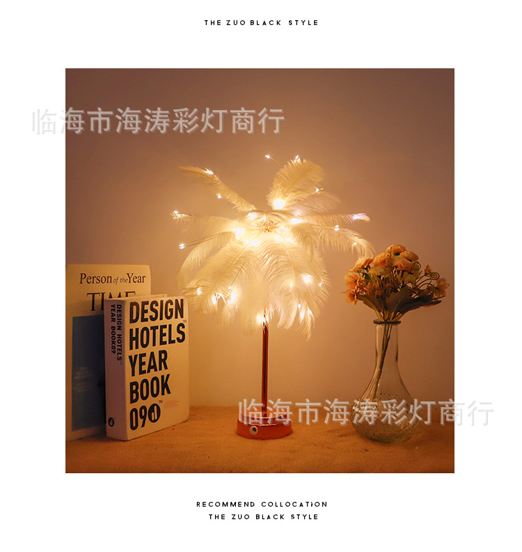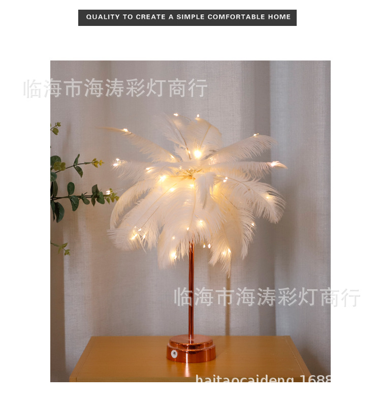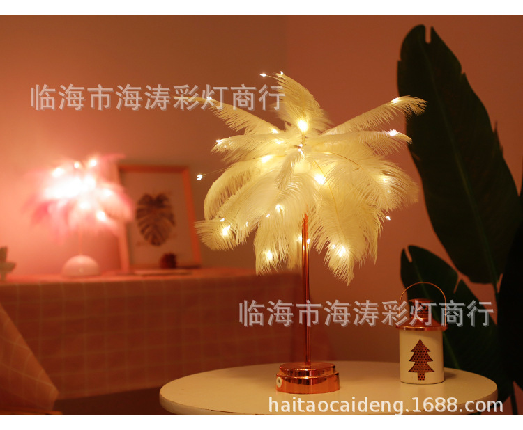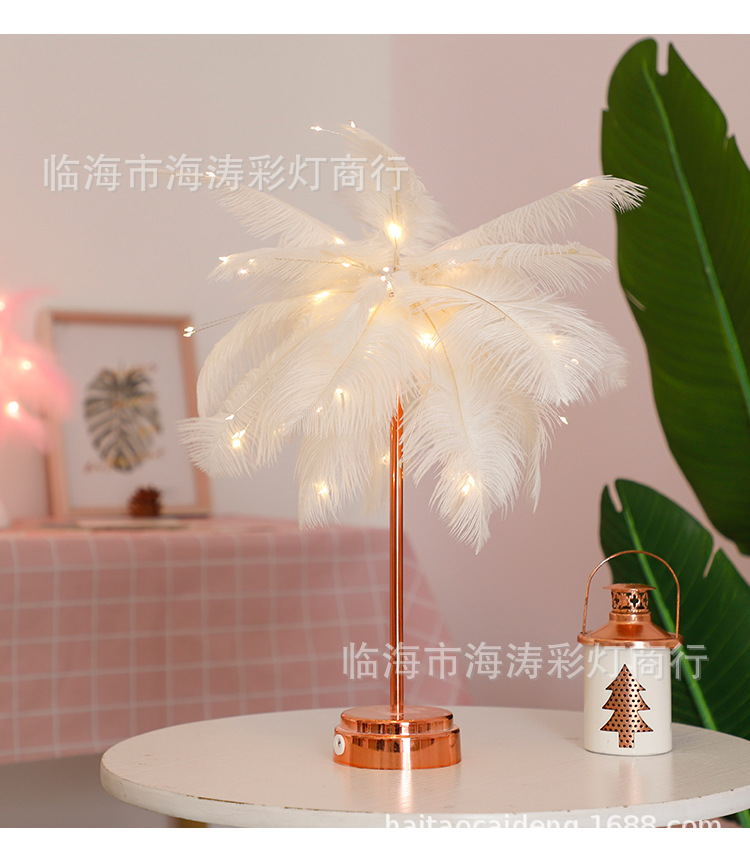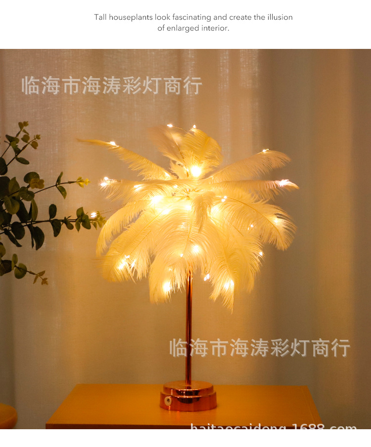 Small feather table lampThe function is always on,20About branches,40LED, expanding diameter35CM,USB, feather25cm, height20cm, base10cmInner package23*10*10, single weight with box,107Gram